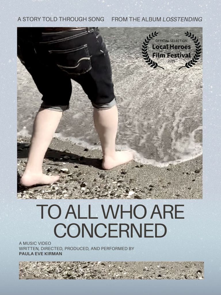 My music video for the song “To All Who Are Concerned” has been selected by the Local Heroes Film Festival (presented by the the Edmonton Short Film Festival) for a special screening of films by women filmmakers on April 24 at 7:30 p.m. at Waffle Bird just south of Whyte Ave. The event is free and features a Q&A with the directors.